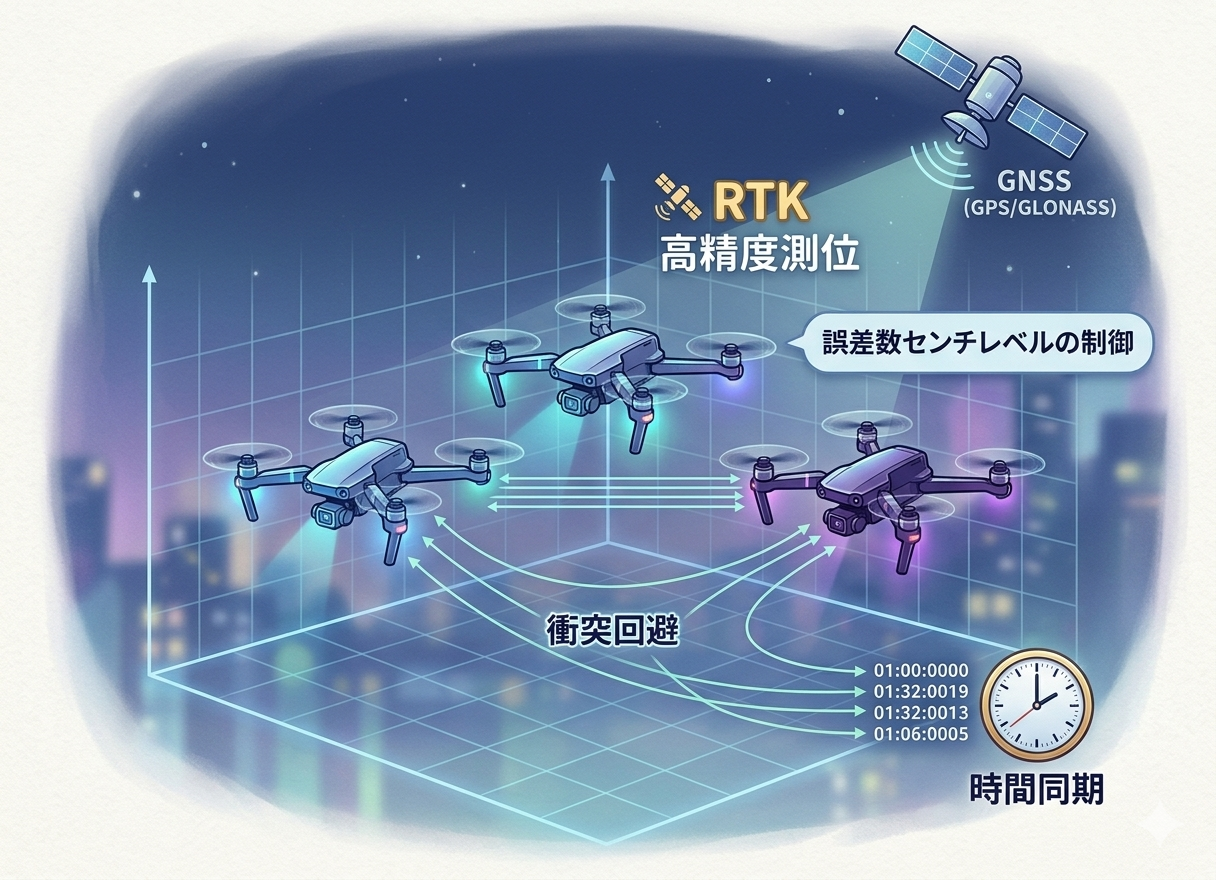 すべての機体が同じ時刻情報と飛行プログラムを共有し、「いつ・どこへ・どの速度で動くか」を正確に実行します。
