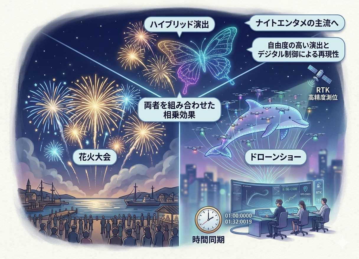 ドローンショーが増えている理由は、「自由度の高い演出」と「デジタル制御による再現性」にあります。